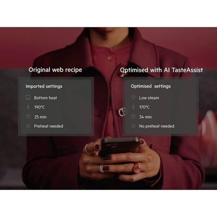 -AI TasteAssist gőz: optimalizálja a hagyományos recepteket. Egyszerűen küldje el a webes receptet a sütőjének az alkalmazásunkon keresztül, és hagyja, hogy az AI optimalizálja az időt, a hőmérsékletet és a funkciót.