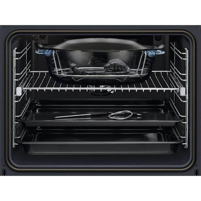1 db szürke zománcozott sütőtálca, 1 db szürke zománcozott zsírfelfogó tálca, 1 db krómozott grillrács, 1 db húshőmérő, 1 pár teleszkópos sütősín, 1 db üveg párolóedény