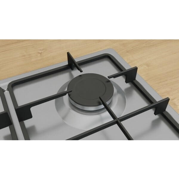 • Bosch PGP6B5K60 beépíthető gázfőzőlap, 60cm, nemesacél, elölgombos vezérlés, szikragyújtás, öntöttvas hatású edénytartó rács