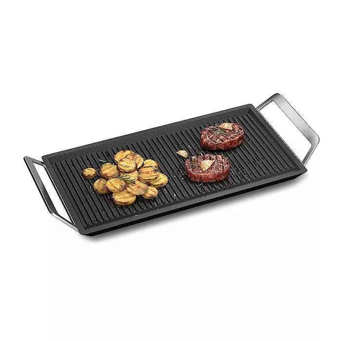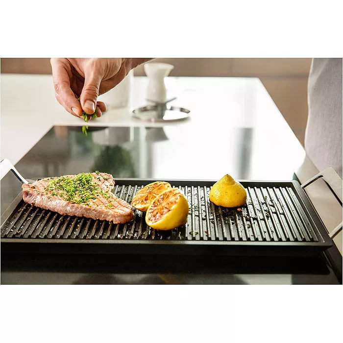 -A grill-lap a Bridge-funkciós indukciós főzőlapokhoz ideális, ahol két zóna összekapcsolódik, így nagy felületen is használható. Strapabíró alumínium öntvény, időtálló, háromrétegű, svájci minőségű letapadás mentes bevonattal.