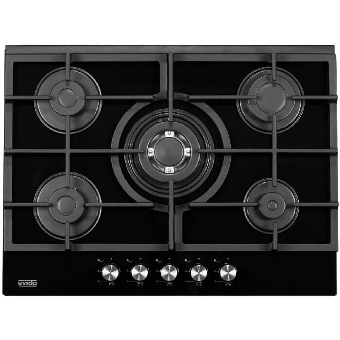 Evido Murano 70B beépíthető üveglapos gázfőzőlap, 70cm, üveglapos, wok, elölgombos vezérlés, szikragyújtás, öntöttvas edénytartók
