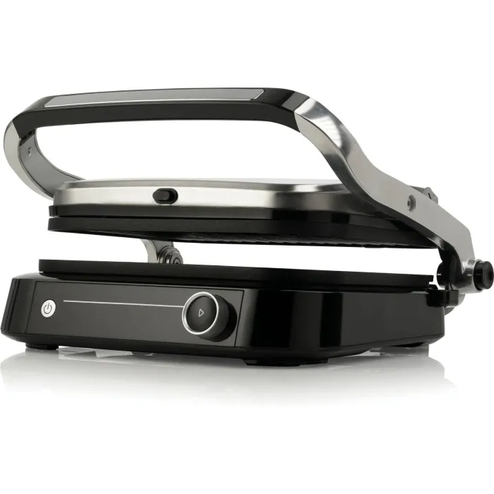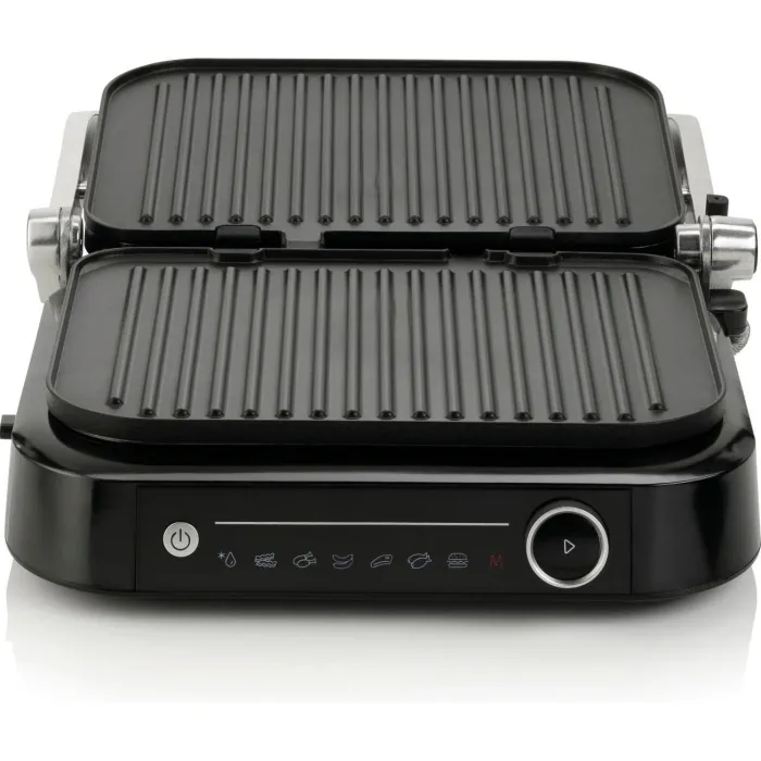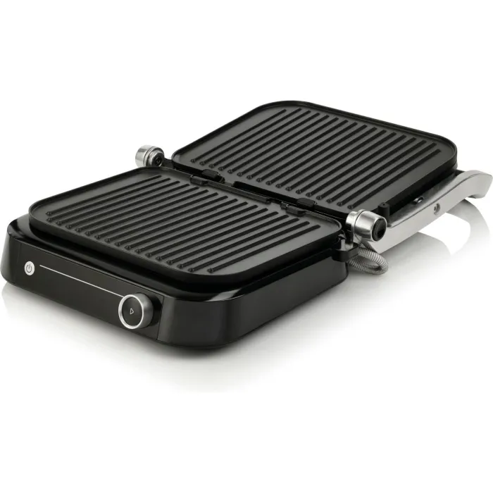 -állítható pozíciók: a kontakt grill lapjainak távolsága a grillezett étel vastagságának megfelelően állítható, illetve a felső sütőlap teljesen ki is hajtható, így a készülék klasszikus asztali grillként is használható